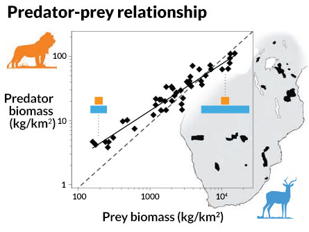The observed predator-prey relationship grew out of Hatton’s Ph.D. work, which started with studying predators and prey in parks in Africa. Hatton burrowed into archived data on the five dominant predators (lions, leopards, cheetahs, hyenas and wild dogs) and the hoofed grazing animals that make up their major prey. With 190 studies from 23 protected natural areas, he and his colleagues calculated the total amount of carnivore flesh in a park and the total amount of prey flesh that supported it.