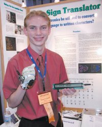 Ryan Randall Patterson, 17, from Grand Junction, Colo., hit upon the idea for his winning project while watching a deaf person struggle to order food in a restaurant. Patterson won one of the $50,000 scholarships for designing a glove with sensors that detect hand motions of the American Sign Language alphabet and transmit the letters to a display.