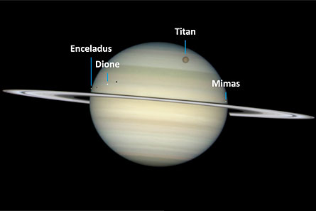 From a distance of 1.25 billion kilometers, Hubble’s Wide Field Planetary Camera 2 recorded the passage of the four moons — giant Titan, Mimas, Dione and Enceladus.