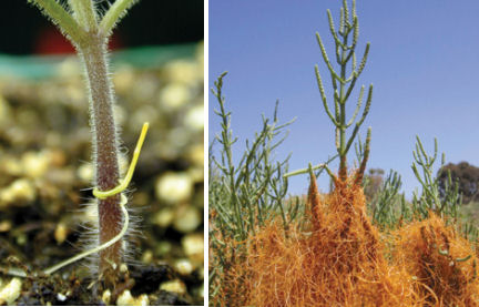 Of the 150 species of dodder, the researchers selected Cuscuta pentagona, says coauthor Justin Runyon, also of Penn State. This species bedevils tomato growers in California, where it costs them an estimated $4 million a year in reduced yields.