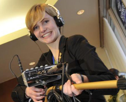Marian Bechtel, a finalist in the Intel Science Talent Search, demonstrates a new mine detector with two microphones that listen for the sound of mines vibrating underground.