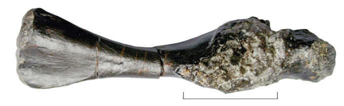 A growth preserved in the fossilized left femur of an ancient turtle relative is the oldest known case of bone cancer in an amniote (bracket indicates the tumor on the several-centimeters-long fossil) (SN: 3/16/19, p. 5).