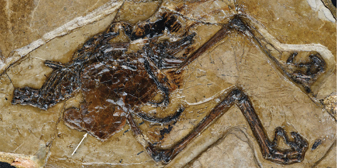 A small bird died with an egg (arrow) still inside her body, and problems laying that egg may have led to her death. Crushed and flattened over time by pressure, the specimen is the first unlaid bird egg found preserved as a fossil (SN: 4/13/19, p. 15).