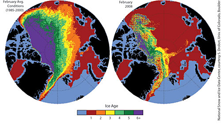 Meier says that this is a record low for perennial ice in winter and a very sharp drop even from last winter. “There’s this fear,” he says, “that we’re going over a cliff, in a sense, with this perennial ice.” He says the planet could be heading towards a situation where there won’t be any perennial ice left in the near future. Only seasonal ice would exist, which means that the Arctic Ocean would be ice-free during the summer.The decline of Arctic sea ice “is an iconic signal of global warming,” Meier says. It’s something that really sticks out “as being clear cut and definitely due to global warming.”
