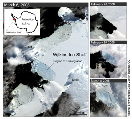 In Antarctica, a large chunk of the Wilkins Ice Shelf recently collapsed into the sea. Satellite images show the Wilkins Shelf began falling apart in late February, when a large iceberg 41 kilometers by 2.5 kilometers (25.5 miles by 1.5 miles) broke away from the shelf. This triggered a runaway disintegration of an additional 405 square kilometers (160 square miles) of the shelf. The total loss was 8.5 times the area covered by New York’s Manhattan island. As of March 23, only a 6 km (3.7 mile) wide strip of intact ice was protecting the shelf from further collapse.Scientists from the U.S. National Snow and Ice Data Center and the British Antarctic Survey put the blame for the Wilkins’ massive melt-triggered event on a warmer world. “We believe the Wilkins [Shelf] has been in place for at least a few hundred years,” said Ted Scambos, a lead scientist with the snow and ice data center. “But warm air and exposure to ocean waves are causing a break-up.”