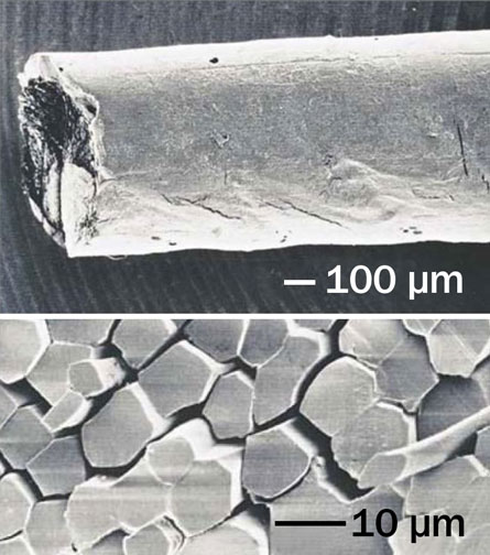 SPIDERVARIUS When bundled and specially treated, thousands of spider silk strands develop facets (top) that allow them to stack tightly together inside a new kind of violin string (bottom) that’s strong and elastic.