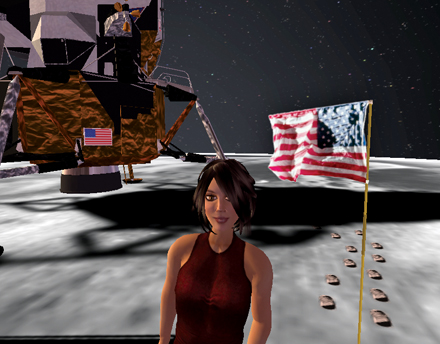 Back in Second Life, I set out for one more place, a destination I will likely never travel to in real life — the moon. I reach the site of the Apollo 11 landing through a link set up by ElonUniversity and grab a pair of space boots. As I explore the moon and the machinery left behind, the boots leave imprints of my tracks on the moon’s surface. Finally, I prepare to leave, stashing my flight feather away in my inventory. I’ll soon be returning to Second Life for a second look.