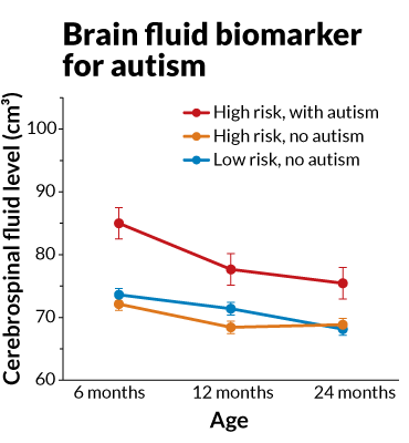 Other work by Piven and colleagues has turned up other brain differences in high-risk babies. Babies who will go on to develop autism have more cerebrospinal fluid on a certain part of the outer layer of their brains than those who don’t develop the disorder. But the results, published online March 6 in Biological Psychiatry, fell short of the predictive power of the brain overgrowth results, Piven says.