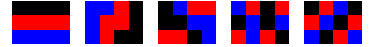 Suppose the starting configuration consists of three horizontal bars, each one a different color (below, left). Each successive application of the transformation shuffles the boxes to create a new pattern.