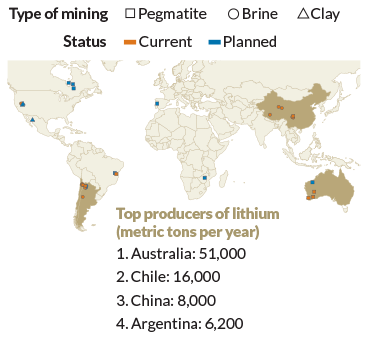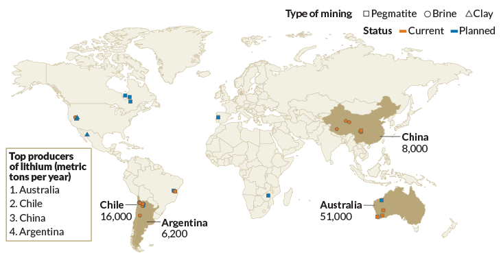 Most of the world’s lithium sources (orange) are pegmatite mines in Australia and China and brine mines in Chile and Argentina. But planned mining ventures (blue) mean that the lithium rush will soon spread to the United States, Canada and Mexico.
