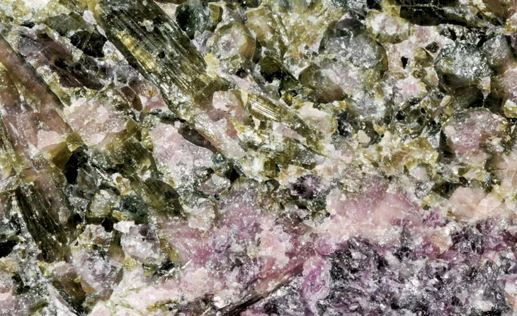 Most pegmatites are a type of granite formed out of molten magma. What makes pegmatites interesting is that they tend to contain a lot of incompatible elements, which resist forming solid crystals for as long as possible. The rocks form as the magma beneath a volcano cools very slowly. The magma’s chemical composition evolves over time. As elements drop out of the liquid to form solid crystals, other elements, like lithium, tend to linger in the liquid, becoming more and more concentrated. But eventually, even that magma cools and crystallizes, and the incompatibles are locked into the pegmatite.