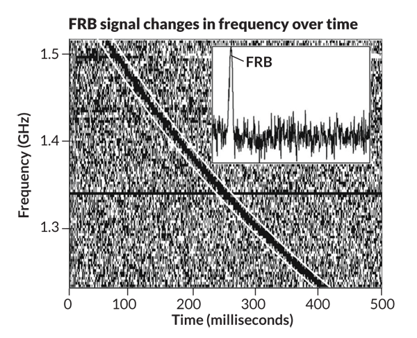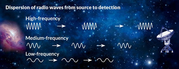 If something blasts out radio waves, all the frequencies leave as a group, but they don’t arrive together at their destination. A radio telescope will see the higher radio frequencies before the lower frequencies. The result, if you could hear it, might sound like a slide whistle. The delay between arrival times indicates how much stuff the light stumbled upon on its way to Earth.