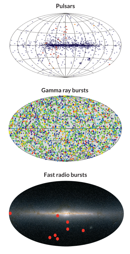 Then in 2013, a team led by Dan Thornton, another Jodrell Bank astrophysicist, snagged four more in archival data from 2011 and 2012. The bursts came from points all around the sky (SN: 7/27/13, p. 8). Each one blasted out radio waves: electromagnetic waves with much lower frequencies than infrared and visible light. Named fast radio bursts, or FRBs, the observations had a few things in common: They were bright, they were brief, and they seemed to be coming from very far away.