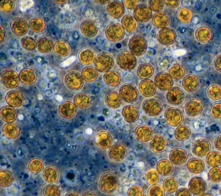 Although turtleweed alga is a beautiful killer of coral, many algae serve essential functions in reef ecosystems. Most corals can’t survive without live-in help from various kinds of single-celled Symbiodinium algae (shown). These algae shelter inside coral tissue, where they capture energy from sunlight and share the resulting sugars and other essential products with their coral landlords. Among bigger algal species, tough cement makers called crustose calcareous algae help hold a reef together and create ridges that withstand pounding waves. Some of these calcareous crusts, such as Titanoderma prototypum, attract coral larvae searching for a home. Small filamentous algae power the base of the food web by serving as underwater meadows that nourish grazing animals. Other algae, largely inedible, such as Halimeda species, offer hiding places for youngsters dodging predators. In some senses, a coral reef is an algal reef too. — Susan Milius