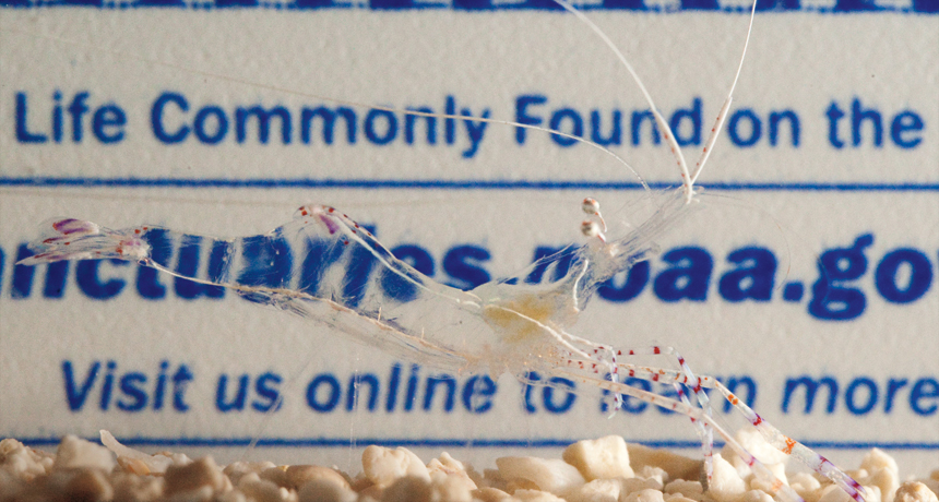 SEE THAT SHRIMP A Pederson’s transparent shrimp, disguised as nothing much, faces right with some translucent yellowish organs near its head.