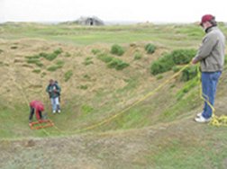 Along a tree line, radar has identified buried features that may be signs of habitation, including the postholes of long-deteriorated structures and pits that may have been used for holding food, fires, or trash. Within the same area, sensitive gradiometers detected magnetic signs of cooking hearths and pot fragments. Fire baking often changes or eliminates the magnetic field within a material, a characteristic that can distinguish it from surrounding sediments.