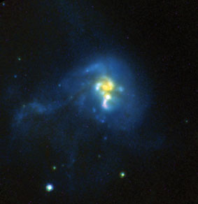 The rejuvenated NICMOS teamed with Hubble’s newly installed Advanced Camera for Surveys to observe a four-galaxy collision a billion light-years from Earth. The infrared-bright regions at the collision’s center produce the equivalent of 200 new suns each year, 100 times more than the Milky Way’s output. Although new stars primarily radiate ultraviolet light, the dust they generate absorbs that light and reemits it in the near-infrared.