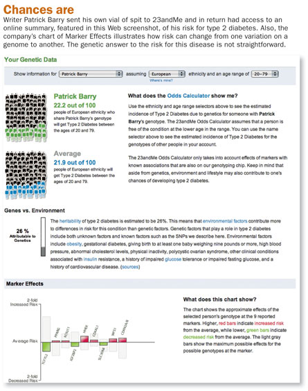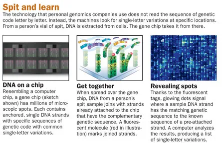 So she posted a comment on a discussion board on the website for 23andMe, a company based in Mountain View, Calif., that specializes in the fledgling industry of personal genomics. To get a glimpse of her own DNA, Richman had sent the company $400 and a vial of her spit. From her point of view, what happened next was a mystery — a black box. But a few weeks later, out popped her results on a password-protected website, complete with social networking tools for sharing and discussing her genetic inheritance with other customers.