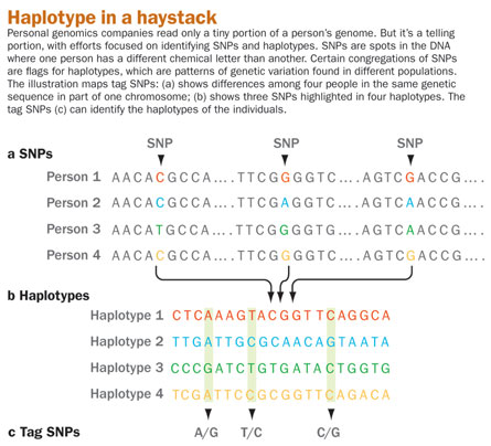 The human genome contains about 10 million known SNPs. That estimate is the latest from the International HapMap Project, an ongoing scientific collaboration that’s mapping these genetic variations. But SNPs near each other on a chromosome tend to get inherited together, making it possible to group neighboring SNPs into units of inheritance called haplotypes. A few tag SNPs are enough to identify each group, so it takes only about 500,000 tag SNPs to reveal a person’s haplotypes. That’s why most gene chips test for at least 500,000 SNPs, and why checking this tiny sliver of the genome — these tag SNPs — can reveal much of the genetic variation that makes a person unique.