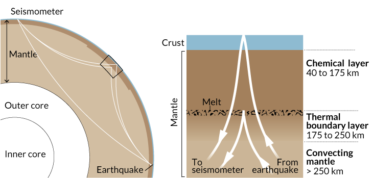Seismic waves take different routes from an earthquake to a seismometer. Some travel deep through Earth’s mantle. Others reflect off a layer of melt in the upper mantle or bounce off the underside of Earth’s surface. By clocking the time it takes these reflected waves to arrive, scientists say they can discern the depth and consistency of a layer of slightly runnier rock that marks the bottom of continental plates.