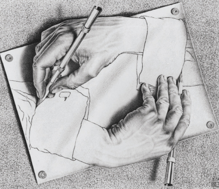 In particular, Hofstadter seizes on Gödel’s insight that a mathematical formula — a statement about a number — can itself be represented by a number. So you can take the number describing a formula and insert that number into the formula, which then becomes a statement about itself. Such a self-referential capability introduces a certain “loopiness” into mathematics, Hofstadter notes, something like the famous Escher print of a right hand drawing a left hand, which in turn is drawing the right hand. This “strange loopiness” in math suggested to Hofstadter that something similar is going on in human thought.