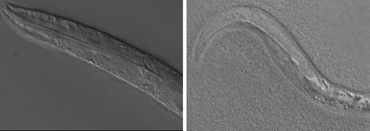 Getting a poison from mom doesn’t matter if she also passes along a gene for the antidote. That’s how many lab C. elegans nematodes grow a normal body (left) with a wide, inner feeding tube (partly visible toward worm top). Without the antidote (right), a worm just grows deformed bits of a tube and can’t pump in the bacteria it needs for food.