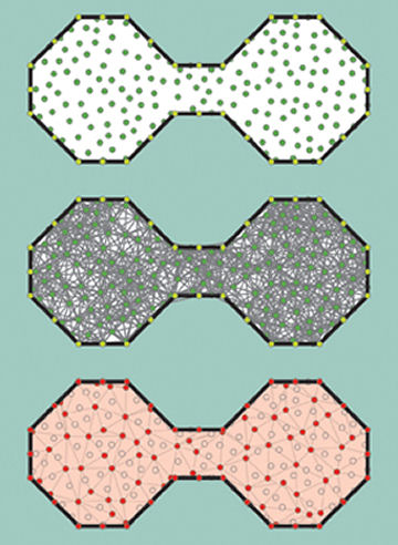 Like the Euler characteristic, homology works best on shapes built up out of what topologists call simplices, namely, corner points, lines, polygons, and their higher-dimensional analogs—objects that are hard to visualize but can be precisely described using mathematical formulas. Accordingly, to apply the power of these topological tools to wireless sensor networks, Ghrist and his collaborators put simplices together into a theoretical shape, called the Rips complex, that captures the intricacies of how the sensors communicate with each other.