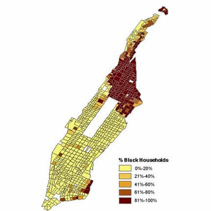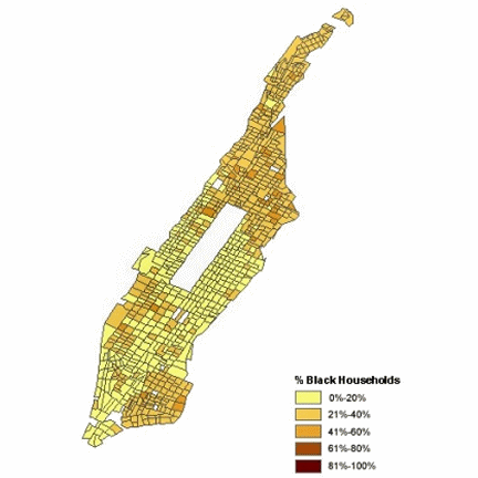 To calculate what racial segregation in Manhattan would look like if it derived only from unequal distribution of income, the researchers created a hypothetical map of the city. In each neighborhood, the income distribution accurately follows data from the 2000 Census, but the demographics are adjusted so that the proportion of black and non-Hispanic white households reflects statistics for Manhattan as a whole. For example, on average across Manhattan, blacks represent 53 percent of black and white households in the lowest income category, with household earnings of less than $10,000 per year. In real life, that percentage varies widely from the average in different neighborhoods, but in the adjusted map, every neighborhood has blacks making up precisely 53 percent of the households in this lowest income category.