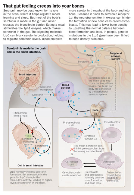 Rosen also wonders how the brain comes into this picture. Although the serotonin in the brain and intestine never meet, evidence suggests that the brain may have other effects on bones. Some of that influence may even act through the digestive system. The hormone leptin suppresses appetite but is also implicated in the regulation of bone mass. And Rosen points to other hints of a brain-bone connection. For example, the rate of new bone formation increases after traumatic head injury.