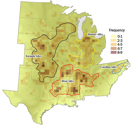 Dixie Alley, centered over Mississippi and northern Alabama, beat out Tornado Alley in tornado number, Frates found. Over the 56 years examined, an average of 2.92 tornadoes hit each cell in Dixie Alley, followed by an average of 2.59 tornadoes in each cell of Tornado Alley. Second and third runners-up are Hoosier Alley (Indiana) and Carolina Alley (centered over both Carolinas).