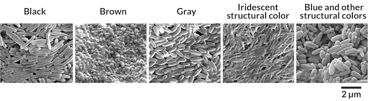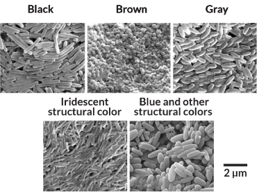 In bird feathers, melanosomes involved in the production of different colors come in different shapes and sizes. Black, brown and gray colors are produced by pigments in the melanosomes alone. Structural colors, whether iridescent or blue or green, are produced in two steps: Light is refracted by an air pocket–filled layer of keratin within the barbs of a feather, and an underlying layer of melanosomes absorbs the rest of the scattered wavelengths of light. But there’s one area of overlap: The melanosomes for those noniridescent structural colors are similar in size and shape to the gray pigment melanosomes.