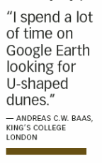 Is a U-shaped geological feature the topographical sign of life that researchers should look for on other planets? Not necessarily, Baas notes. Not all arid regions of Earth have been surveyed for dune types, so parabolic dunes might be out there in grass- and shrub-bare areas. Also, he notes, in the alien environments of other planets, some unknown chemical or physical processes could mimic the dune-freezing action of vegetation. In an effort to find more parabolic dunes on our planet, Baas says, “I spend a lot of time on Google Earth looking for U-shaped dunes.”
