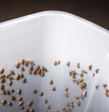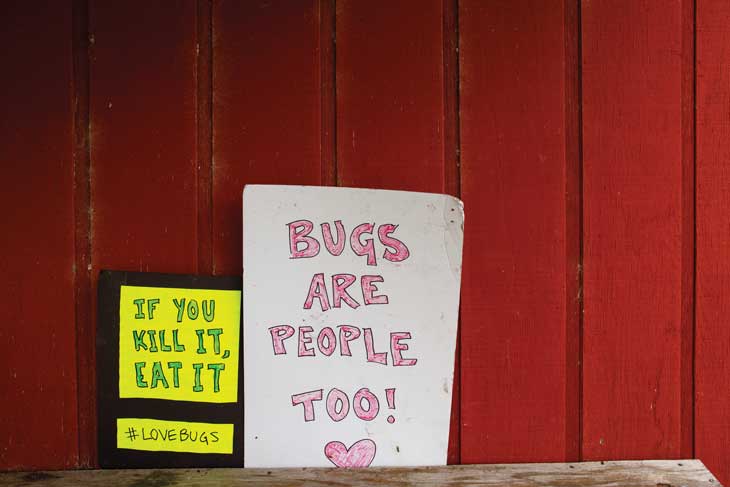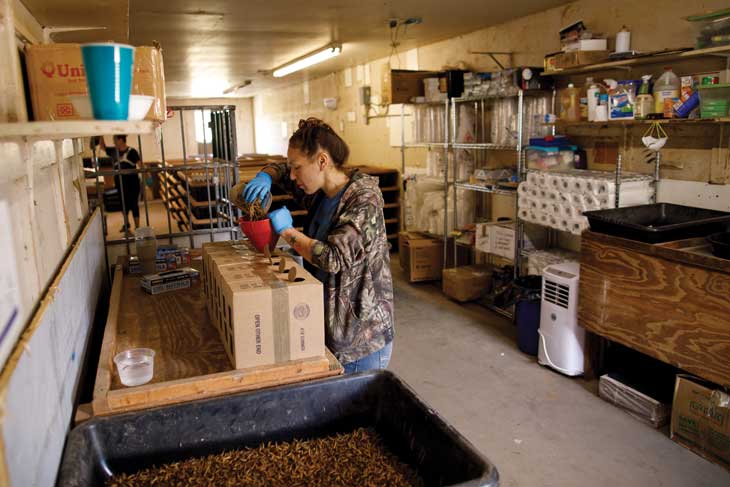 Imagining Tequila Ray Snorkel as a rebooted Henry Ford, I follow her to a cricket breeding area, where females lay eggs in make-do, metal baking pans filled with moist peat moss like lumpy cake mix. From here, the egg pans get moved into what looks like a decent-sized heated closet with flypaper strips curling down from the ceiling. Snorkel points out that the racks holding the pans stand with their feet in little dishes of water to repel ants. Insect pests bedevil all kinds of farms, but they’re a special menace at insect farms because pest control can kill the livestock too.