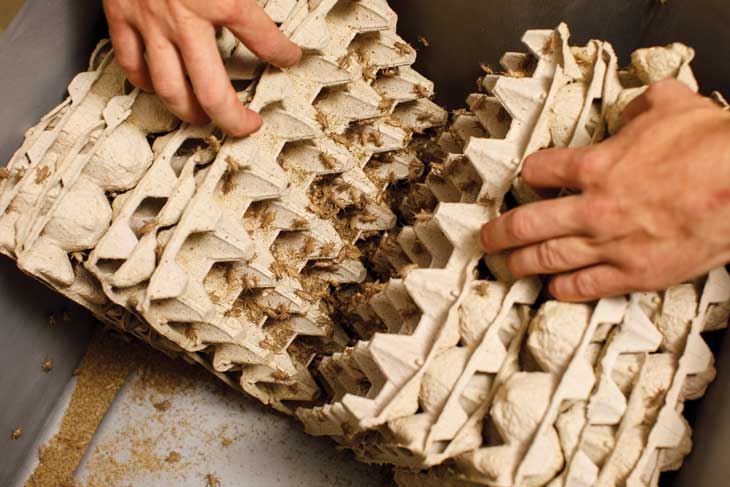 Below the fencing, I see stacks of egg separators propped around the edges. These grayish, cardboardlike rectangles with deep dents to hold chicken eggs safe and upright have become the industry standard for sheltering crickets. I see crickets tucked into the indents and huddled just under the lips.