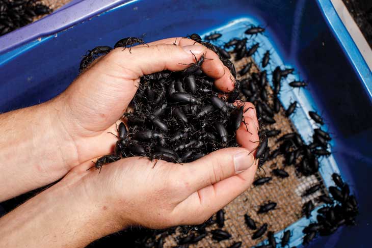 Some farms have already diversified beyond crickets. Among its reptile foods, Lazy H raises discoid roaches, one of the few kinds that Florida allows people to cultivate on purpose. “We love the roaches,” Chiasson says. They withstand temperature fluctuations and shipping better than the crickets do. “They don’t smell as bad,” she adds. And when a roach dies in the tank, cleanup is easy: The other roaches eat most of it.
