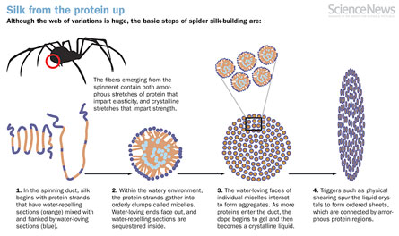 Silk proteins come in a rich array of structures, but generally, the molecular structure of silk consists of regions of protein crystals separated by less organized protein chains, Kaplan says. As the spider dumps more and more silk protein into the spinning duct, the protein forms a gel and gradually organizes into a liquid crystalline phase. Then, in a feat that would make Rumpelstiltskin jealous, the spider pulls the fiber from its spinneret. The fiber shears in such a way that crystals form and, in one-tenth of a second, the dope goes from liquid to solid.
