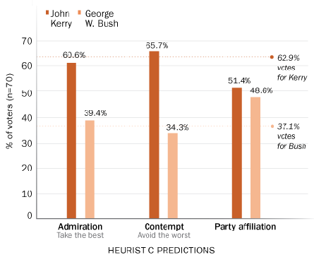 Simply by noting whether Bush or Kerry received a higher admiration rating from each voter, Wang closely predicted the final voting breakdown of study participants. A prediction based on which candidate received a lower contempt rating worked almost as well. In fact, participants’ levels of admiration and contempt for candidates substantially outperformed their party affiliation in predicting their final vote.