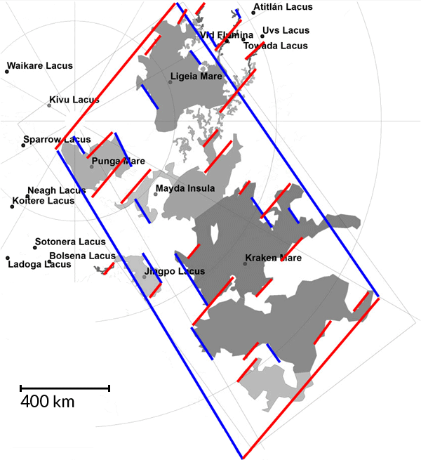 TITAN TECTONICS Titan remains mysterious but this new mosaic image suggests that tectonic activity and sinkholes created seas and lakes (blue-black) near the moon’s north pole. Using radar data collected by the Cassini spacecraft, scientists pieced together this picture of Saturn’s largest moon.
