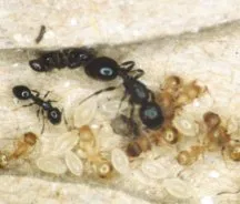 Small Leptothorax slaves tend a big slave-making ant queen. Hare