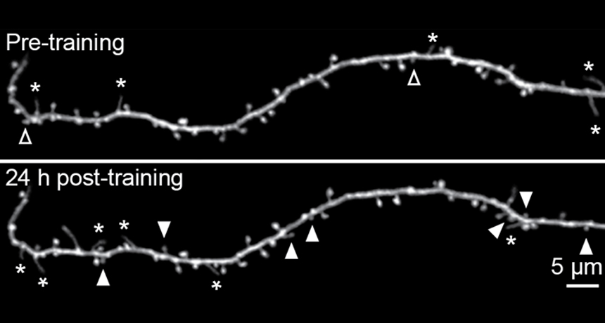 Right after their training session, some mice were allowed to sleep for seven hours. Neurons in these mice’s motor cortices sprouted new dendritic spines, which are docking sites where other neurons can connect, Gan and his team found. But mice that were kept awake didn’t form as many new spines. These sleep-deprived mice were also worse at balancing on the rod days later, the team found. These new docking sites may not all have become working synapses — the communication conduits between neurons. But the presence of the new dendritic spines suggests that overall, connections between the neurons are getting stronger, the researchers say.