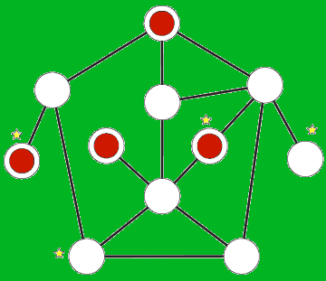 Place four coins on the red circles. Slide the coins along the paths so that there is a coin on every starred circle. At no time may any two coins be adjacent—occupying two circles joined by a path. You should be able to solve this puzzle in 28 moves.