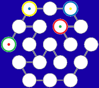 In this puzzle, each of four tokens has a different color, as shown by the colored circles. Your goal is to move each token to the circle containing a dot of the same color. Solving this particular puzzle requires 116 moves.