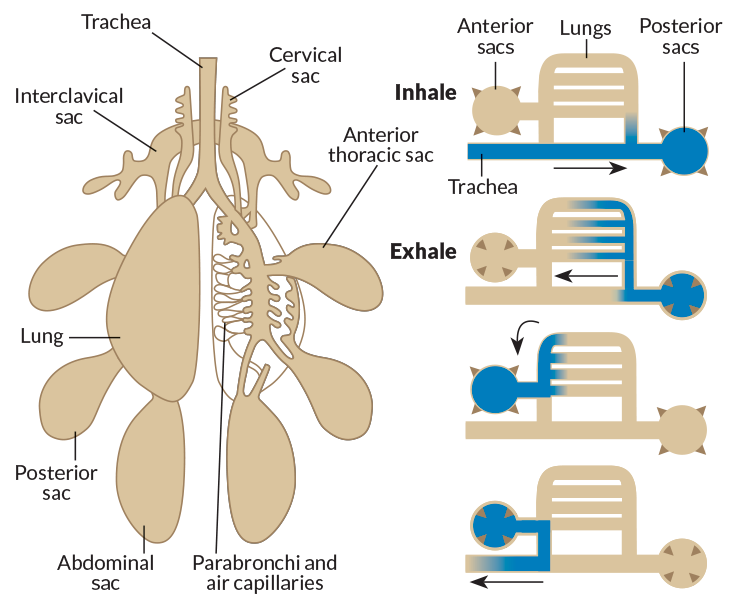 In people, air flows like the tides. Inhale, and air whooshes in. Exhale, and the air recedes along the same path, depleted of oxygen and laden with waste gas. Physiologists have believed that other vertebrates share this basic two-way tidal flow — except for birds.