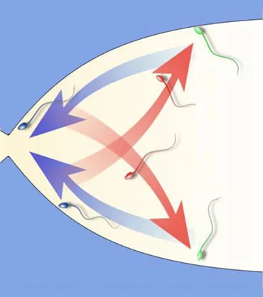 Through computer simulations and tests of sperm, Abbaspourrad and colleagues found that the fastest sperm, when stopped by the current at a narrow point, could make it back to a wall, swim along it and try again. Repeated, this movement resulted in a butterfly-shaped pattern. Whether a swimmer could get through ultimately depended on the speed of the fluid through the narrow point and the speed of a sperm.
