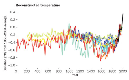 Someone looking at a graph of global temperature since worldwide instrumental records began in 1880 might reasonably conclude that the recent upward trend is not terribly extreme. But longer records are available. The ones shown here use a number of “proxy” records: tree ring thicknesses, the chemical composition of lake and ocean sediment cores, rates of coral growth and other natural phenomena that vary with temperature. Each colored line represents a slightly different interpretation of the data, but they all clearly point to the same conclusion: The past few decades have been the warmest in centuries.