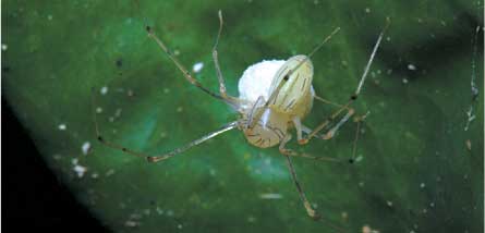 PRENATAL ESCAPE A female pale spitting spider can’t spit at predators while carrying an egg mass.