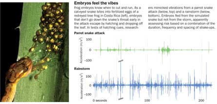 Today, looking for changes in hatching time as a reaction to danger is becoming a cottage industry among biologists, Warkentin says. She and her team have now shown that red-eyed tree frog embryos can shorten their time in the egg by some 30 percent if attacked by snakes, wasps or killer molds. And embryos of at least 17 other species of amphibians can split open their eggs for an early escape in a crisis, according to various studies. So can two species of fish as well as a lizard.