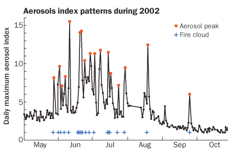 In addition to aerosols such as smoke and soot, fire-fueled clouds inject unusually large quantities of chemically reactive gases such as carbon monoxide, methyl cyanide and hydrogen cyanide into upper layers of the atmosphere, data suggest. Scientists are somewhat concerned about the ultimate effects of these gases on atmospheric chemistry and the planet’s climate.