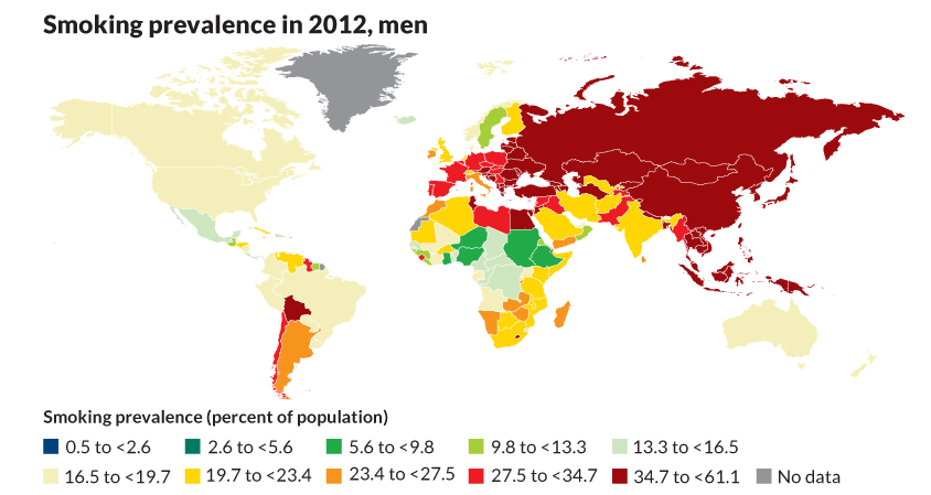 Globally, smoking rates declined over this period, dropping from 41 percent to 31 percent in men and from nearly 11 percent to 6 percent in women. But because of population growth, the total number of daily smokers increased from 721 million to 967 million.