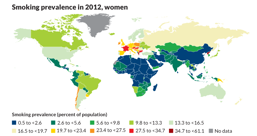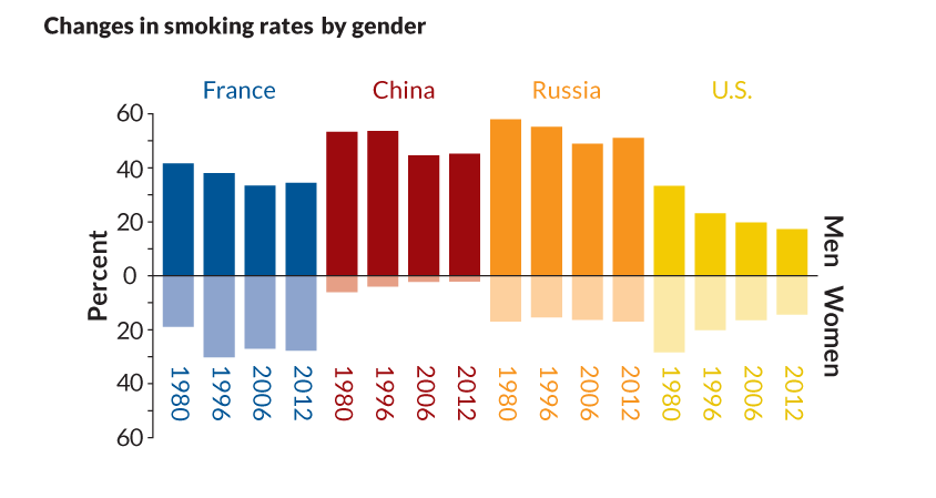 A study of tobacco smoking patterns reports that more men than women smoke in every country except Sweden. In some nations, the smoking disparity between the sexes is large. But smoking is on the rise among women in some countries, especially in the Middle East and Eastern Europe. The biggest increases in smoking among women from 1980 to 2012 were in Saudi Arabia, the United Arab Emirates and Tunisia.